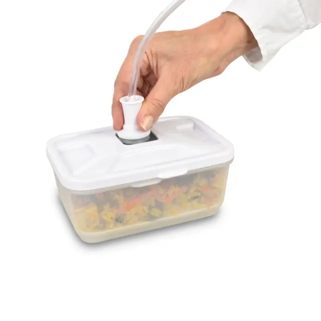 Povežite cevko na vakuumsko tesnilo in jo pritisnite na sivi ventil na pokrovu. Zrak v škatli se izsesa, kar ustvari vakuum.