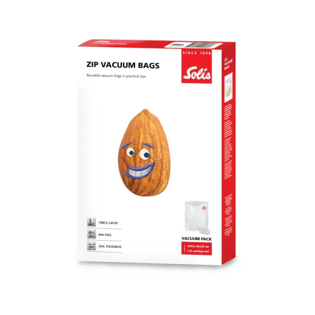 Zip vakuumske vrečke Solis za večkratno uporabo so popolne za ljubitelje kuhanja. Primerno za suis-vide metodo. Primeren je za shranjevanje hrane: če hrano vakuumirate, bo ostala petkrat dlje sveža. Zaradi tega boste zavrgli manj hrane. Solis zip vakuumske vrečke ne vsebujejo BPA in ohranijo vse arome hrane. Primerno le za vakuumske naprave Solis. Zapiranje s patentnim zapiralcem Zapiranje s patentnim zapiralcem za enostavno odpiranje in zapiranje. Teksturirana površina Teksturirana površina za boljše vakuumiranje zraka. Daljši rok trajanja hrane To si želimo, kajne? Brez izgube arome Zaščita pred izgubo arome in ozeblinami hrane v zamrzovalniku. Primerno za globoko hlajenje Primerno za globoko hlajenje (–20 °C) in kuhanje v vakuumu. Primerno za pomivanje v pomivalnem stroju. Primerno za pomivanje v pomivalnem stroju in večkratno uporabo. TEHNIČNI PODATKI Material Troslojni (varen za hrano) Debelina vrečke 150 - 170 µm Brez BPA Da Mokra hrana Da Hrana, občutljiva na pritisk Da Primerno za kuhanje Sous-vide Da Primerno za zamrzovalnik Da (>-20°C) Primerno za prekuhavanje vode Da (6h / 90°C) Namenjeno večkratni uporabi Da