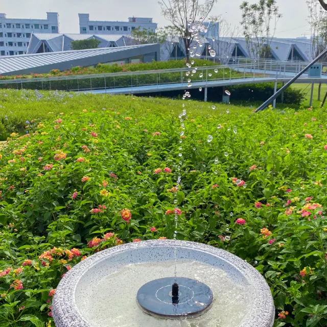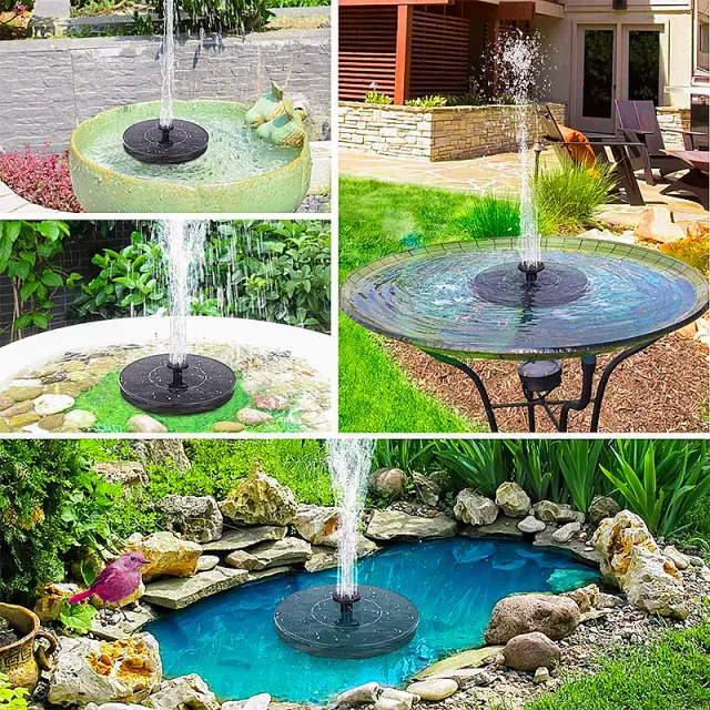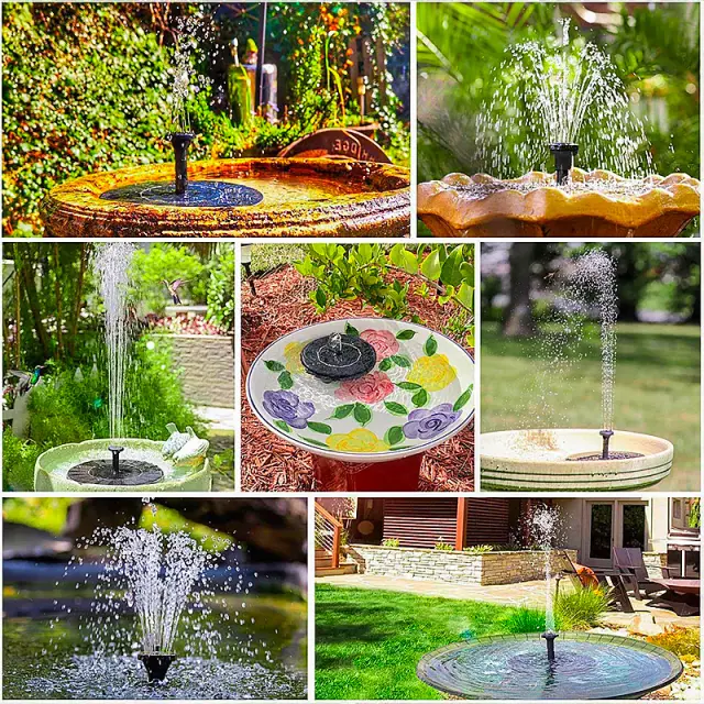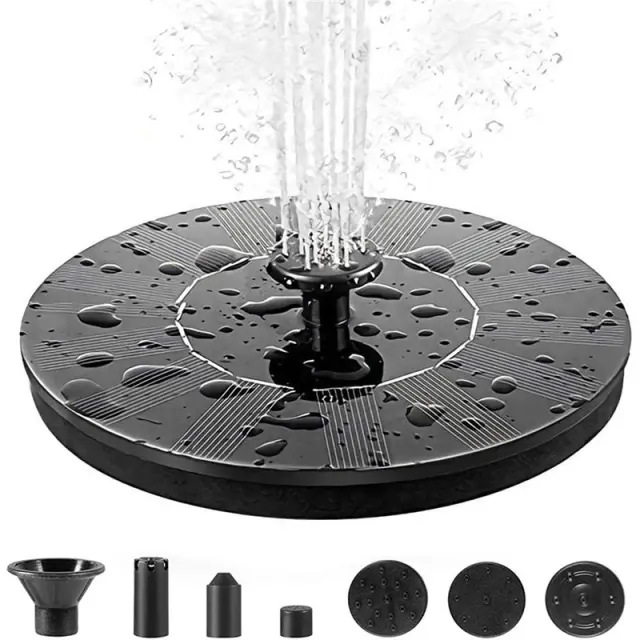 Delovanje na sončno energijo: Ta fontana, opremljena z enokristalno sončno ploščo s kapljičnim lepilom, deluje na sončno energijo. Solarna plošča ima nazivno napetost 6V, nazivno moč 1W in deluje pri napetosti DC 4,5-12V. Višina pršeče vode 30-50 cm. Priključite lahko različne šobe za vodnjak, da dosežete različne višine pršenja vode.