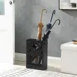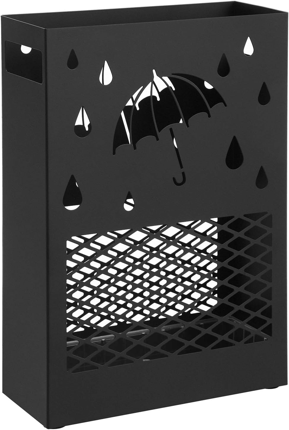 SONGMICS Kovinsko stojalo za dežnike, pravokotno stojalo z odstranljivo posodo za kapljanje vode, 4 kljukice, dizajn z izrezi, za hodnik in pisarno, črna, model LUC004B01