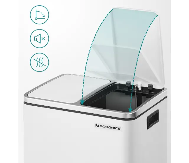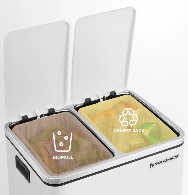 Ločevanje odpadkov s preprostim korakom: 2 predelka omogočata enostavno ločevanje odpadkov. Vse, kar morate storiti, je, da stopite na stopalko, da odprete pokrov, in tako imate obe roki prosti za odlaganje reciklažnih materialov.
