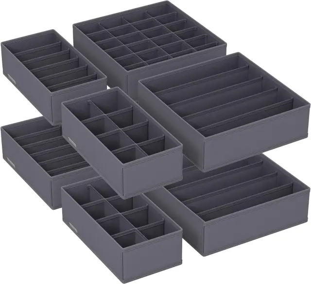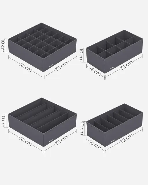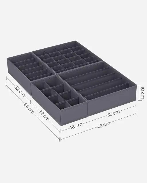 RAZLIČNA ORGANIZACIJA: 8 kosov prostora za shranjevanje ustreza različnim potrebam po organizaciji: dva 5-celična organizatorja (32 x 32 x 10 cm) za nedrčke, dva 6-celična (32 x 16 x 10 cm) za šale ali hlače, dva 8-celična (32 x 16 x 10 cm) za kravate in dva 24-celična (32 x 32 x 10 cm) za nogavice ali druge dodatke