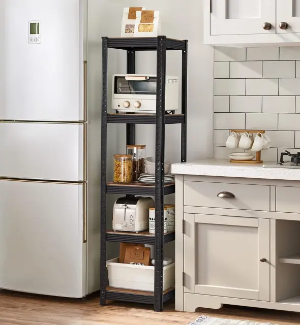 Nastavljive police: Sestava te police ne zahteva vijakov. Zahvaljujoč utorom se deli enostavno povežejo, prav tako pa lahko prilagodite višino med policami glede na svoje potrebe.