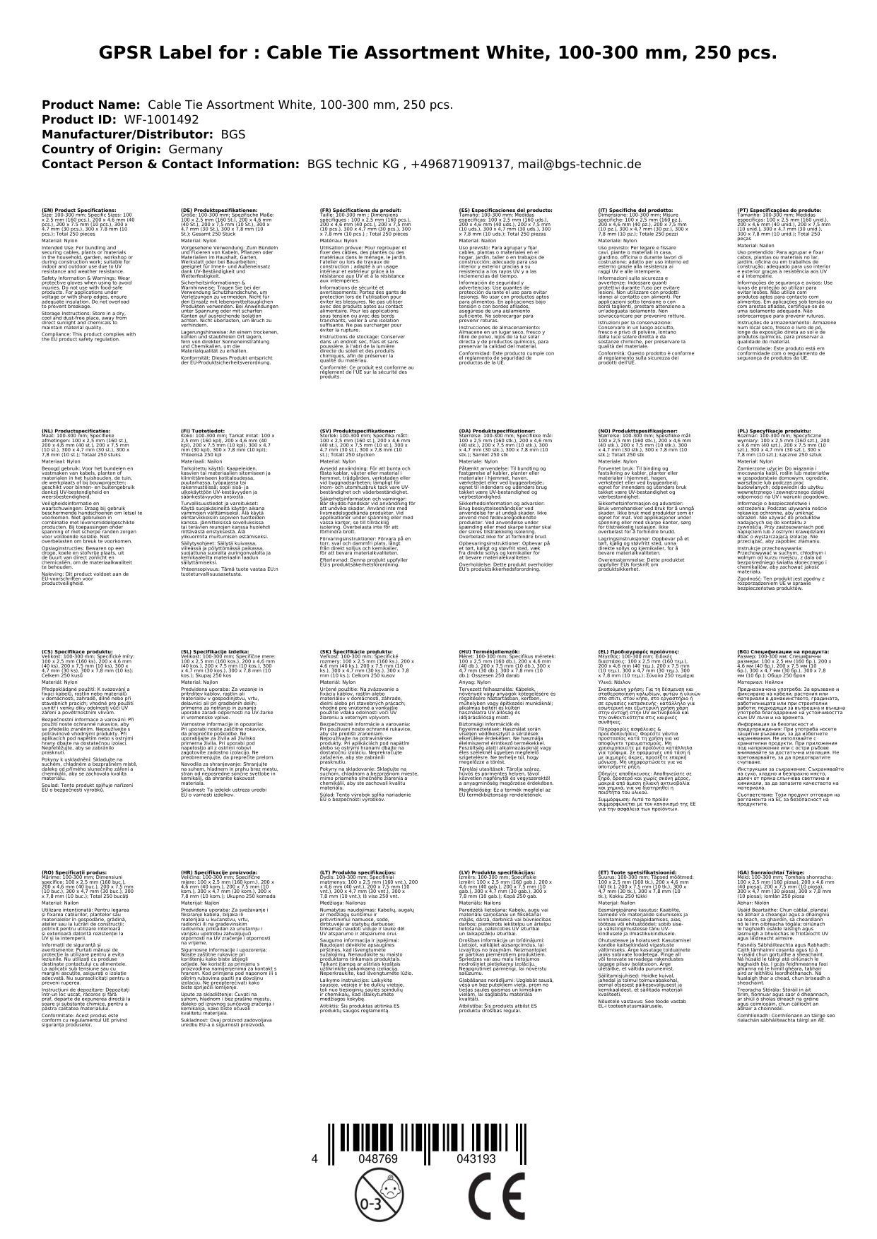 Sortirani beli plastični vezici 100-300 mm, 250 kosov, najlon, UV odporni
