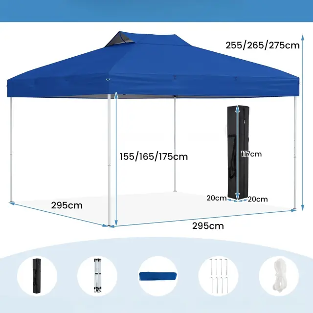 Velika senčna površina: S prostorno pokrito površino 295 x 295 x 255-275 cm (D x Š x V) ta instantni zunanji gazebo zagotavlja veliko sence za vaša srečanja. Ponuja tudi tri enostavno nastavljive višine (255/265/275 cm), da se prilagodite svojim potrebam in uživate v večjem udobju pod velikodušno senčno površino.