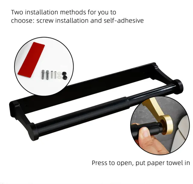 Enostavna namestitev: To držalo za papirnate brisače lahko namestite brez vrtanja lukenj. Priložen je močnim lepilnim trakom, ki se varno pritrdijo na različne površine, vključno s ploščicami, steklom in lesom.