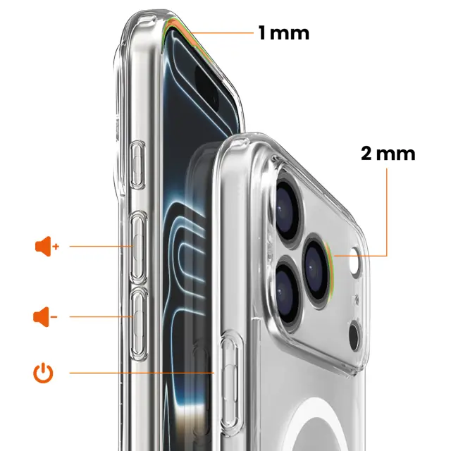Vgrajen magnetni obroč za natančno poravnavo z združljivimi polnilniki in dodatki MagSafe. Matiran polikarbonat je zasnovan tako, da zmanjšuje količino prstnih odtisov, hkrati pa ohranja vidnost prvotne zasnove.. Prilagodljiva oblika in vogali, ojačani z zračno blazino, pomagajo ublažiti udarce pri običajnih padcih. Prilagodljiva oblika in vogali, ojačani z zračno blazino, pomagajo ublažiti udarce pri običajnih padcih.