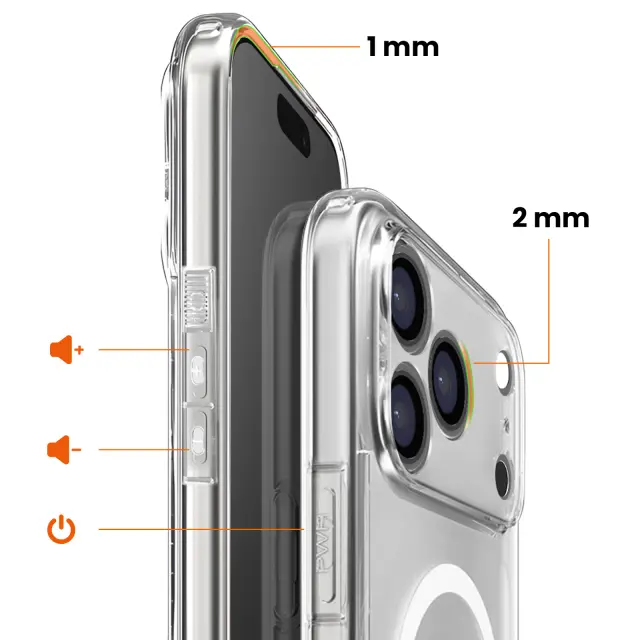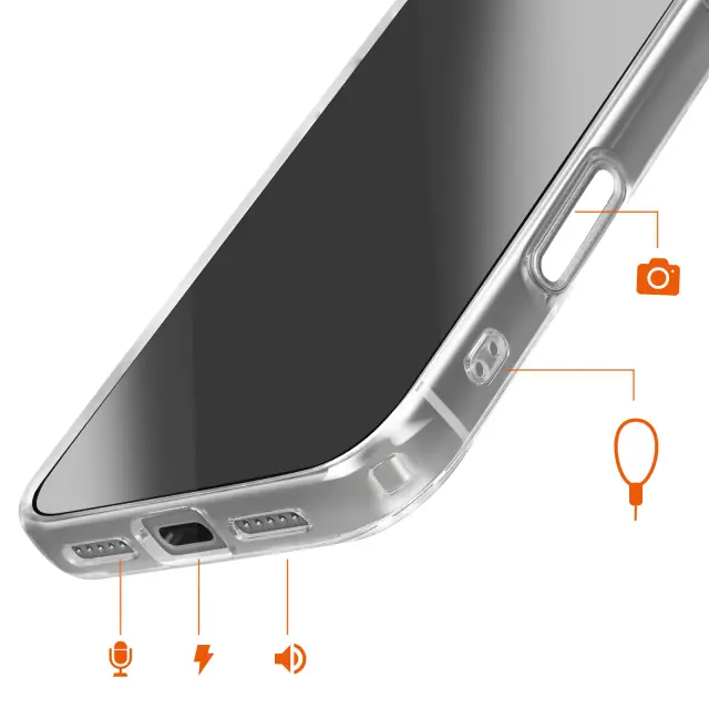 Ojačani vogali s sistemom Air Cushion za blaženje udarcev pri običajnem rokovanju. Vgrajen magnetni obroč za natančno poravnavo z združljivimi polnilniki in dodatki MagSafe. Vgrajen magnetni obroč za natančno poravnavo z združljivimi polnilniki in dodatki MagSafe. Nekoliko dvignjeni obrisi pomagajo zmanjšati neposreden stik med površino zaslona in foto modula..