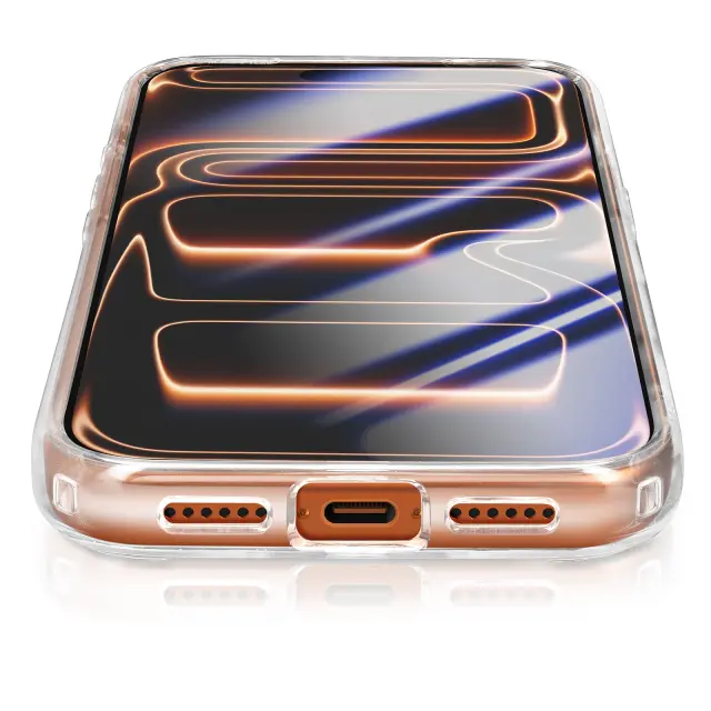 Hibridna zaščita z ojačanimi vogali Zaščita pred udarci Air Cushion. Vgrajen obroč MagSafe za stabilno magnetno polnjenje in pritrditev. Dvignjeni robovi ščitijo zaslon in kamero pred praskami in udarci. Odzivni gumbi in natančno prileganje za optimalno udobje uporabnika.