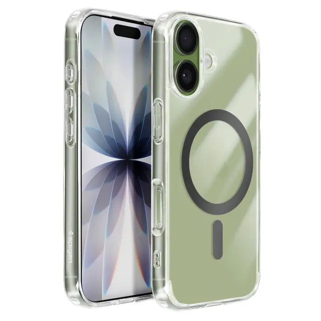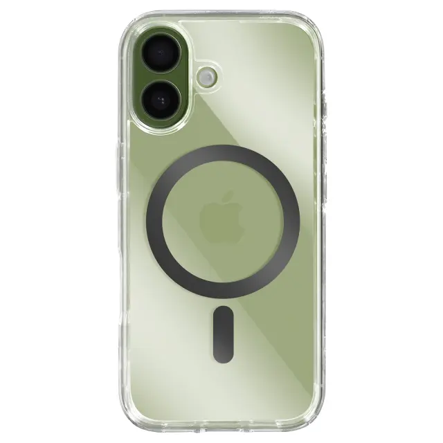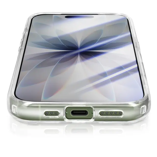 Hibridna zaščita z ojačanimi vogali Zaščita pred udarci Air Cushion. Vgrajen obroč MagSafe za stabilno magnetno polnjenje in pritrditev. Dvignjeni robovi ščitijo zaslon in kamero pred praskami in udarci. Odzivni gumbi in natančno prileganje za optimalno udobje uporabnika.