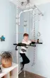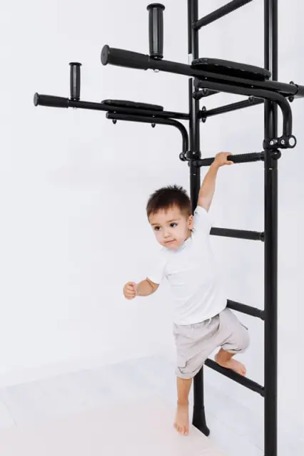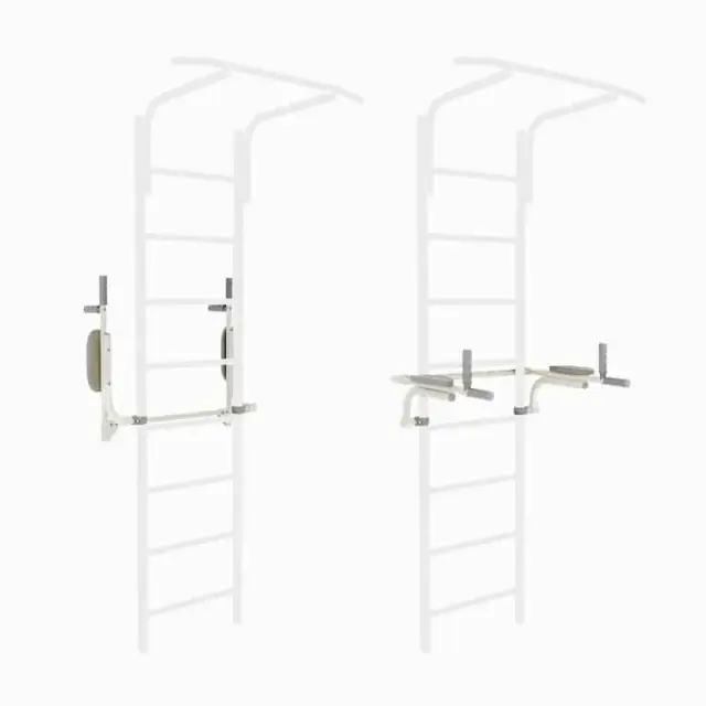 S trebušnimi ograjami, ki so trajno nameščene na gimnastično lestev, se otroška lestev spremeni v domačo telovadnico za starše. Držala pomagajo pri vadbi trebušnih mišic ter mišic rok in prsnega koša. Držala imajo mehke naslone za roke in zaobljene ročaje z nedrsečo prevleko. Ročaji za dvigovanje so iz skupine fitnes pripomočkov za odrasle za gimnastične lestve poleg klopi za vadbo in stojala za uteži. Ročaj za dvigovanje je trajno pritrjen na gimnastično lestev, ko ga ne uporabljate, pa se enostavno zloži v pokončen položaj in umakne v prostor med lestvijo in stransko steno.