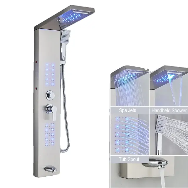 • Moderný dizajn: Pozdvihnite estetiku svojej kúpeľne s elegantným, moderným sprchovým panelom, ktorý obsahuje štýlové LED osvetlenie, ktoré pridáva luxusný nádych.