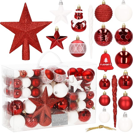 Rdeče svetleče kroglice za božično drevo. Ta paket vsebuje 104 okraske za božično drevo, vključno z zabavnimi dizajni, kot je rdeči snežak z belim šalom, zvezde, zvite ledenice, reliefni bleščeči rdeči okraski in ljubki zvončki. S toliko različnimi dizajni kroglic so možnosti okrasitve neskončne. Tradicionalna rdeča bo videti odlično na ozadju zelenih smrekovih vej ali na pravih ali umetnih girlandah. Poleg tega je naš XXL komplet dopolnjen z zvezdo, ki jo postavite na vrh božičnega drevesa. Lastnosti izdelka: Material: plastika Število: 104 kroglice + konica (+/- 1 kroglica) Priložen trak za obešanje. Barve se lahko nekoliko razlikujejo od dejanskih, odvisno od parametrov prikaza.