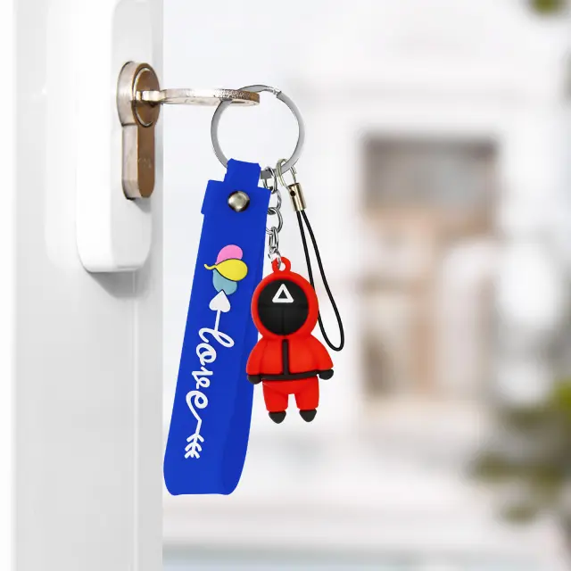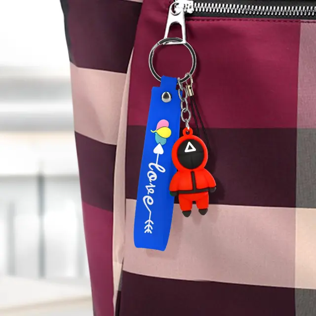 Šaljiv obesek za ključe iz znane južnokorejske serije Squid Game. Posebej zasnovan za pritrditev na ključe, etui za pametni telefon ali torbo. Squid Game vojak, da vašemu pametnemu telefonu da pridih izvirnosti. Silikonski zapestni trak za ergonomsko držanje telefona ali ključev.