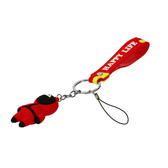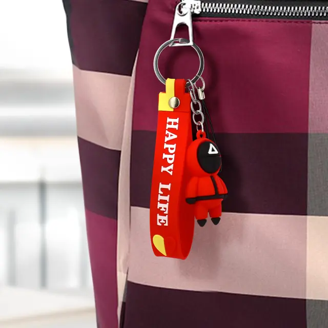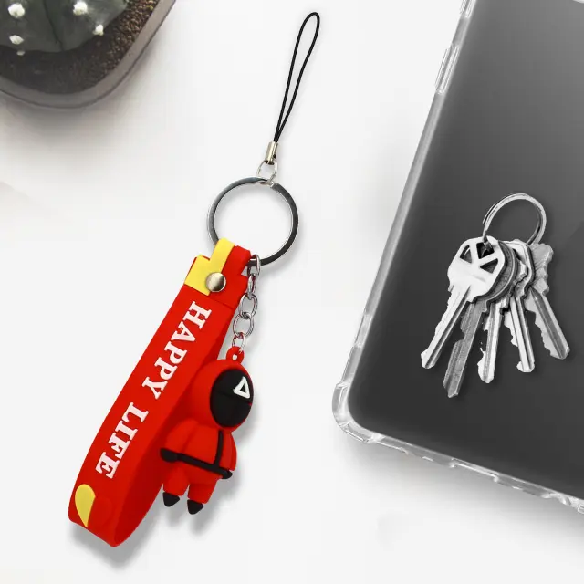 Šaljiv obesek za ključe iz znane južnokorejske serije Squid Game. Posebej zasnovan za pritrditev na ključe, etui za pametni telefon ali torbo. Squid Game vojak, da vašemu pametnemu telefonu da pridih izvirnosti. Silikonski zapestni trak za ergonomsko držanje telefona ali ključev.