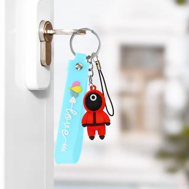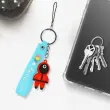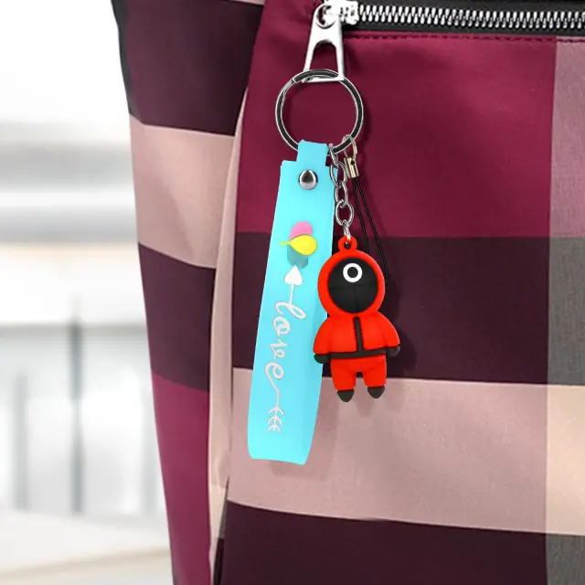 Šaljiv obesek za ključe iz znane južnokorejske serije Squid Game. Posebej zasnovan za pritrditev na ključe, etui za pametni telefon ali torbo. Squid Game vojak, da vašemu pametnemu telefonu da pridih izvirnosti. Silikonski zapestni trak za ergonomsko držanje telefona ali ključev.