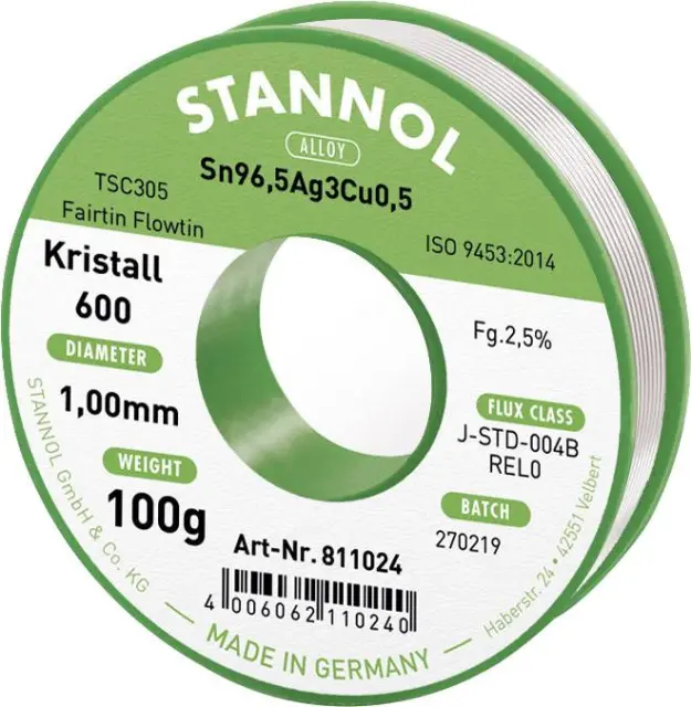 Stannol mehka spajkalna žica Kristall 600 v zlitini Flowtin TSC305 z 2,5% pretoka 1,0mm v premeru na 100 g koluta Stannol Kristall 600 Fairtin spajkal