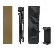 Komplet vsebuje: Ta stativ za pametni telefon je opremljen z vsem, kar potrebujete: samim stativom, varno sponko za telefon, trpežno torbo iz oxfordske tkanine za enostaven transport in elegantnim usnjenim etuijem.