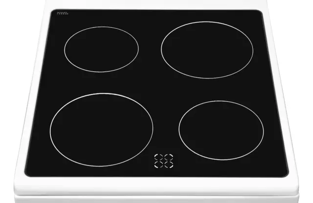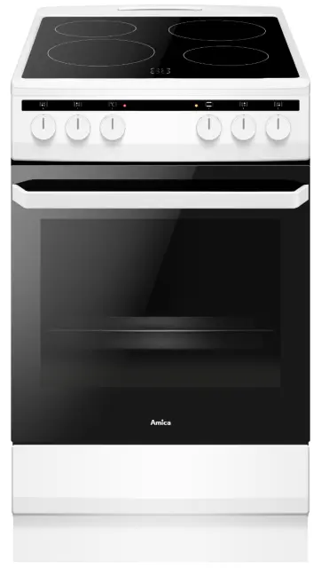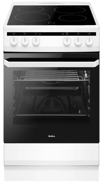 Prostostoječi štedilnik bele barve je širine 50 cm in s štirimi steklokeramičnimi ogrevalnimi površinami. Pečica ima na vratih trojno zasteklitev in kar 62L prostornine. Posledično sprednje steklo na dotik ni vroče, ponuja pa 8 funkcij pečenja.