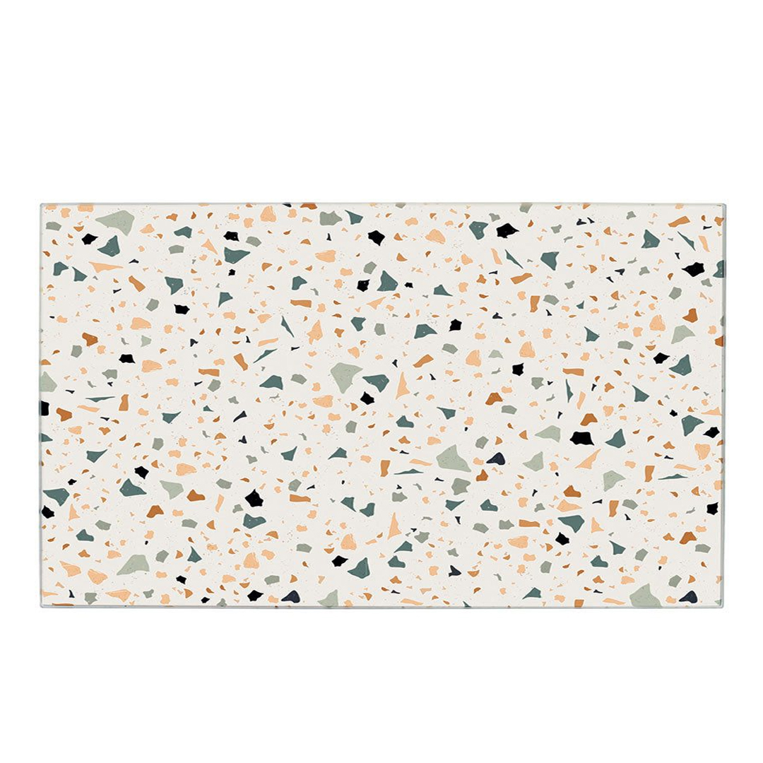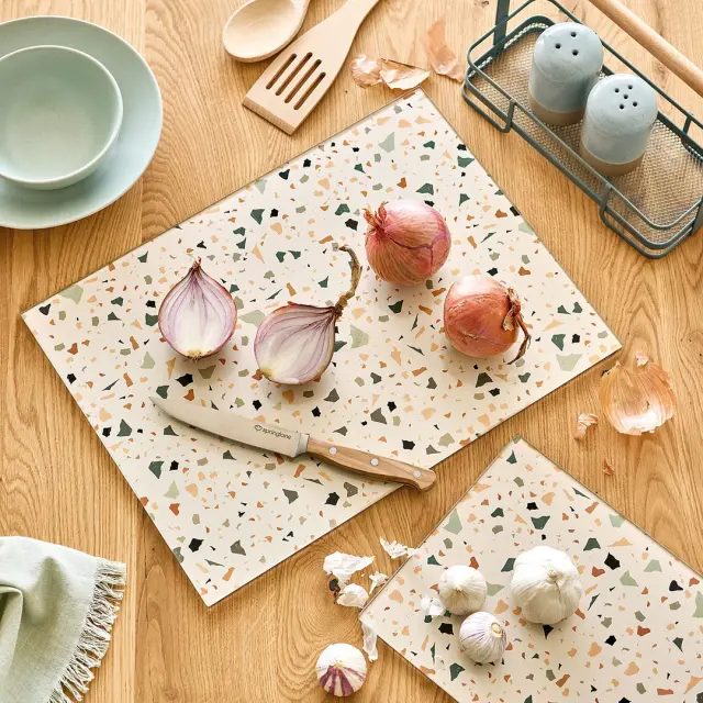 Steklena deska za rezanje Terrazzo, dimenzije 52 x 30 cm je izdelana iz kaljenega varnostnega stekla in se lahko uporablja tako za rezanje, kot pokrov za prekrivanje steklokeramične in indukcijske kuhalne površine ali kot podaljšek pomivalnega korita. Tako vam nudi dodaten delovni prostor in hkrati ščiti kuhalno ploščo. S svojim privlačnim terrazzo dizajnom se brezhibno prilega vsakemu kuhinjskemu interierju. Zahvaljujoč nedrsečim silikonskim nogam deska ostane trdno na mestu tudi med pripravo. Silikonske noge nudijo deski dodatno oporo in preprečujejo njeno drsenje med rezanjem. Čeprav je odporna na vročino (do 220/240°C), je priporočljivo, da jo uporabljate na že ohlajenih kuhališčih, da zagotovite njeno dolgo življenjsko dobo. Sodobni gospodinjski pomočnik je pralen, higienski in izjemno odporen na ureznine. Pomijte ga ročno.