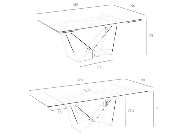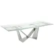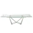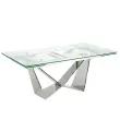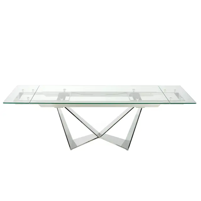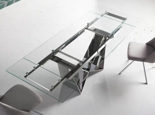 Raztegljiva steklena jedilna miza model 1027 Angel Cerdá S.L. Raztegljiva jedilna miza s pravokotno 10 mm ploščo iz kaljenega stekla s poliranimi robovi in dvema 30 cm podaljškoma. Zaradi prozornosti stekla je viden mehanizem za odpiranje raztegljive mize, zato je njena zasnova veliko bolj edinstvena in inovativna. Poleg tega je ta sodobna miza zaključena z originalno 22-mikronsko kromirano nogo iz nerjavečega jekla. Oblikovalski kos, ki bo postal glavni protagonist prostora. - STIL: Ta raztegljiva jedilna miza bo vsaki dnevni sobi ali jedilnici dodala sodoben pridih. Njena sodobna oblikovna obdelava in raztegljiv mehanizem na pogled nudita tisto avantgardno in stilsko vzdušje, ki ga iščete za svoj dom. - Vsestranska in funkcionalna oblika omogoča, da se prilega najnovejšim trendom na področju dekoracije. - KAKOVOST: Vse naše jedilne mize so izdelane iz najkakovostnejših materialov, kar zagotavlja trajno in funkcionalno pohištvo. - DEKORACIJA IN UDOBJE: Zaradi kombinacije stekla in kromiranega jekla je ta izvirna jedilna miza odličen element, s katerim lahko v svojo jedilnico prenesete svoj značaj in avantgardno osebnost. - RAZMERE: Zahvaljujoč raztegljivim nogam boste mizo lahko raztegnili od 160 cm do 220 cm, tako da boste imeli večjo vsestranskost, saj boste lahko glede na svoje potrebe prilagodili zmogljivost in sprejeli svoje goste ter uživali v prijetnih družabnih dogodkih