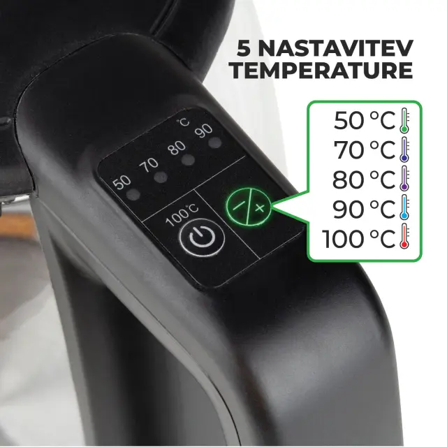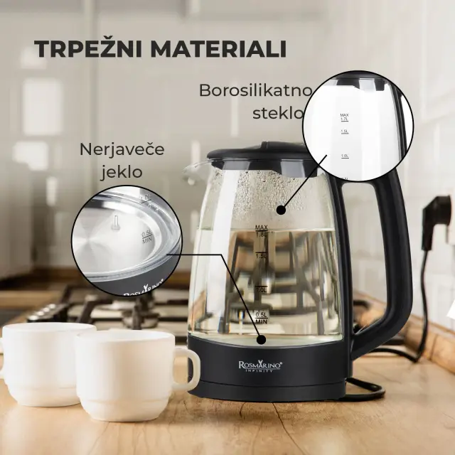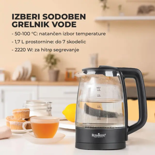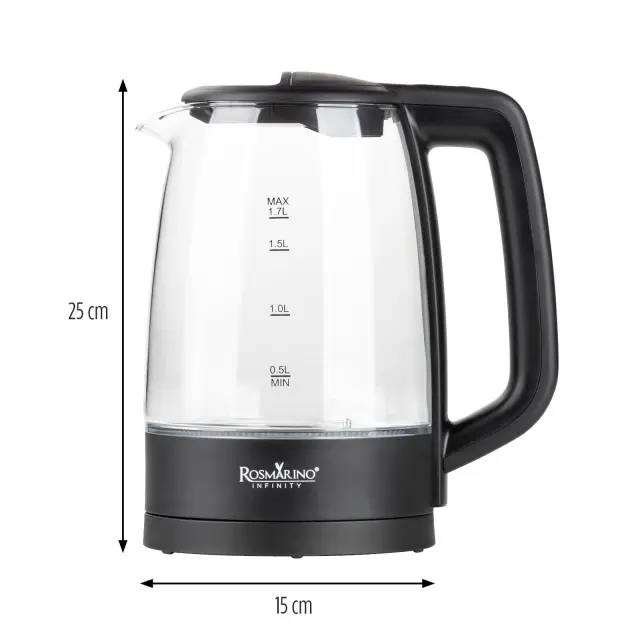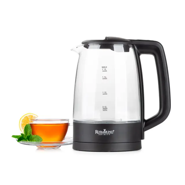 Grelnik vode Rosmarino Vitalia GlowHeat je tvoja vrhunska izbira za hitrejše in res natančno segrevanje vode. LED osvetlitev z različnimi barvami ti prikaže 5 stopenj temperature: od 50°C do 100 °C, med katerimi lahko izbiraš. Hitro segrevanje v 1,7 litrskem grelniku zadošča kar do 7 skodelic vode. Izdelan iz trpežnega stekla in nerjavečega jekla, da se izogneš škodljivim stikom s plastiko.