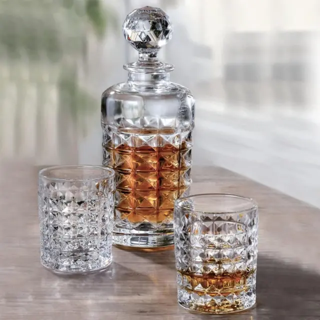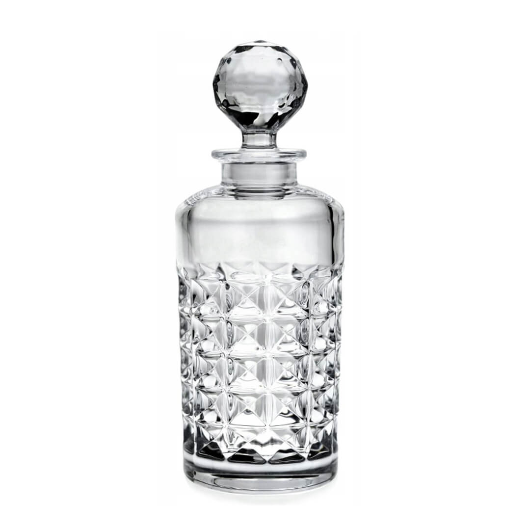 Steklenica za viski Diamond je izdelana iz kristalnega stekla brez svinca z bogatim diamantnim reliefnim videzom. Popoln sijaj in prosojnost stekla se lepo podata tako v tradicionalne kot moderne interierje. Steklenica ima prostornino 700 ml in je idealna za serviranje viskija, ruma in žganja. Lahko jo pomijete v pomivalnem stroju, a priporočamo ročno pranje. Višina: brez zamaška: 210 mm / z zamaškom: 270 mm