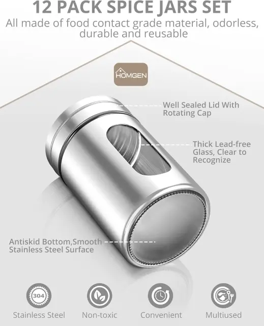 Sklop kozarcev za začimbe: Dodate lahko poper/prah, piščančjo esenco, čili v prahu, čili v prahu itd., shranite 90 ml, vsak kozarec za začimbe ima 3 tri luknje različnih velikosti. Visokokakovostni materiali: 304 material brez svinca steklo in nerjaveče jeklo, visoka trdota, odporen proti obrabi, ni ga lahko poškodovati in deformirati. Dobro tesnjenje: ta kozarec za začimbe ima zasnovo navojnega pokrova z zasukom, ki ga ni enostavno zmočiti. Priročno in higiensko. Preprosto opazovanje: Steklenička je izdelana iz visoko prosojnega in sijajnega stekla, zaradi česar je dišava v steklenički zlahka vidna. Nasveti: Pred uporabo jo operite s čisto vodo. Steklene izdelke lahko čistite z vodo in detergentom. Ne sterilizirajte neposredno z vrelo vodo pri visokih temperaturah.