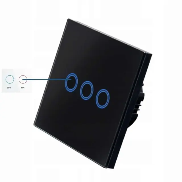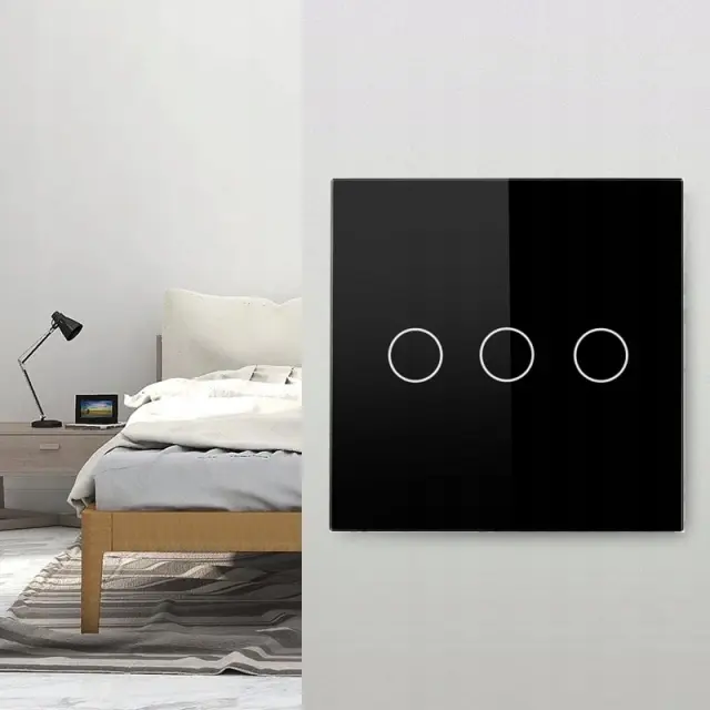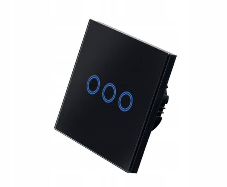 Trojno stekleno stikalo na dotik, ustvarjeno za modno, sodobno notranjost. Stikalo kvadratne oblike in univerzalno črne barve. Njegova preprostost bo navdušila vse, ki ga uporabljajo. Združuje modernističen dizajn in najvišjo kakovost izdelave. Sprednji del stikala je izdelan iz kaljenega stekla, odpornega proti poškodbam. Stikalo z dimenzijami 86 x 86 x 35 mm ima tri gumbe na dotik, ki v pripravljenosti svetijo modro (porabijo le 0,02 W), pri delu pa z rdečo barvo.