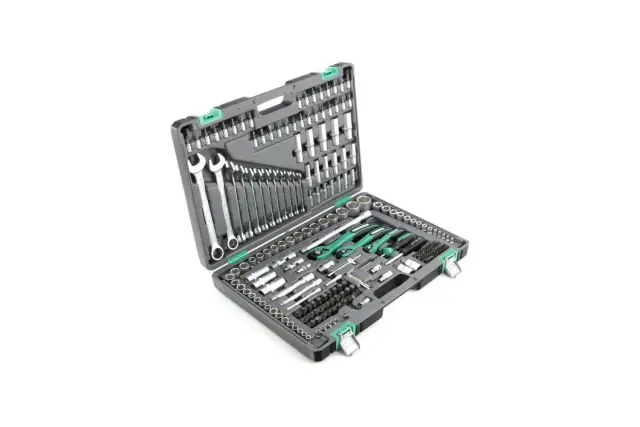 Set orodja Stels, 1/4. 3/8 in 1/2 inča, jeklo CrV in S2, sestavljeno iz 216 kosov in pakirano v ojačanem plastičnem kovčku.