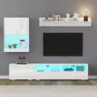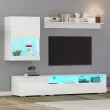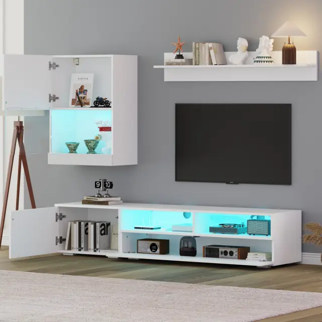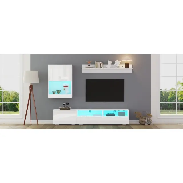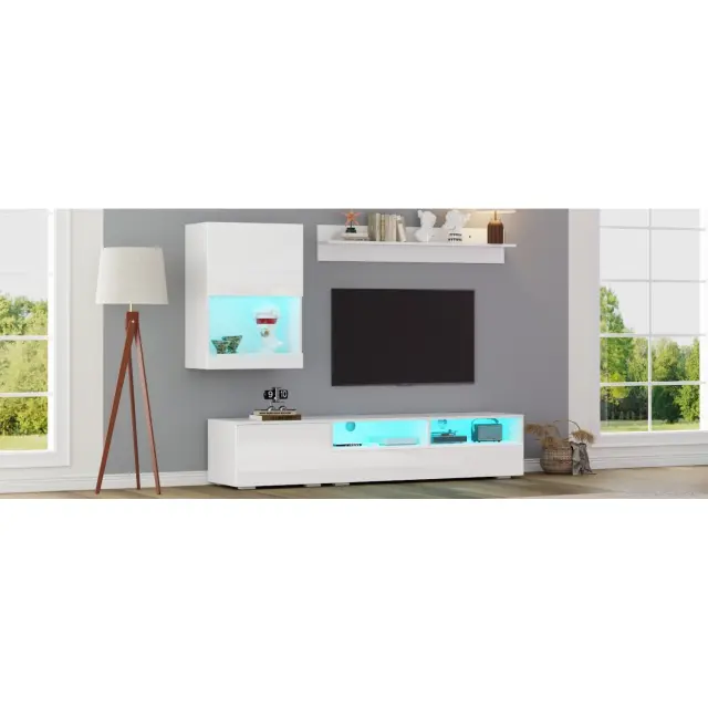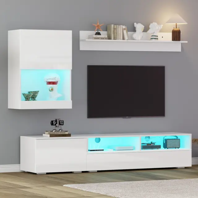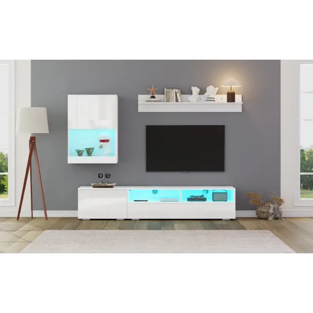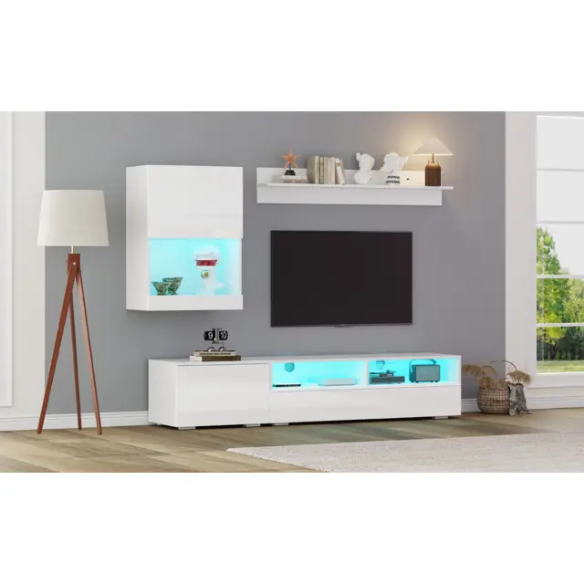 Ta 3-delni komplet TV pohištva je sestavljen iz TV omarice, stenske enote in police. Ima LED osvetlitev, visokosijajne sprednje strani in tečaje z mehkim zapiranjem.