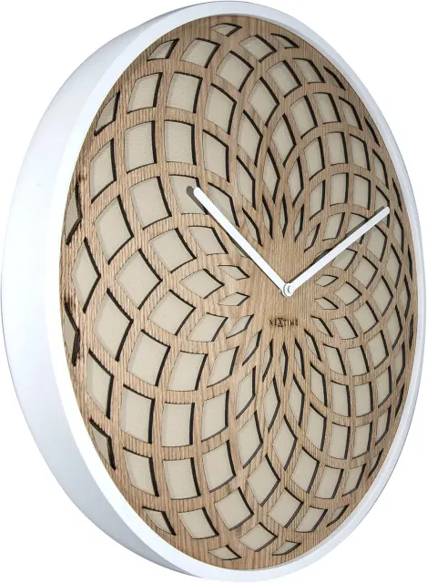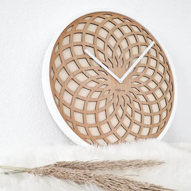 Stenska ura NeXtime SUN predstavlja edinstven dekorativni element, ki v vaš bivalni prostor prinaša orientalski pridih in moderen dizajn. To veliko uro je zasnovala priznana oblikovalka Jette Scheib, odlikuje pa jo edinstven vzorec mandale v kombinaciji z elegantno prevleko iz blaga. Bel okvir in bež ozadje z belimi kazalci ustvarjata harmonično celoto, ki se popolnoma poda k različnim slogom notranje opreme. Zaradi svoje velikosti in estetske zasnove postane osrednja točka vsakega prostora, od dnevnih sob do pisarniških kabinetov.