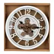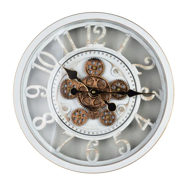 Osrednji del ure izstopa z vidnimi, gibljivimi zobniki, ki ustvarijo industrijski značaj in dodajo občutek dinamike. Kontrast med temnejšo podlago ter zlatimi kazalci in dekorativnimi detajli v odtenkih medenine poskrbi za prefinjen videz in dobro berljivost. Ohišje je izdelano iz kakovostne plastike s sijočo površino, zato ura deluje urejeno in moderno.