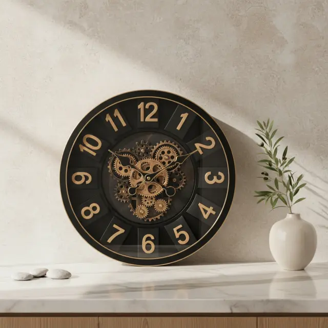 Mat črna podlaga je dopolnjena z detajli v medeninastem tonu, zlate kazalke pa poskrbijo za jasen kontrast in lažje odčitavanje. Ohišje je izdelano iz plastike s sijajem, zato deluje urejeno in sodobno ter se lepo vklopi v različne sloge opreme.
