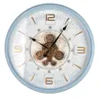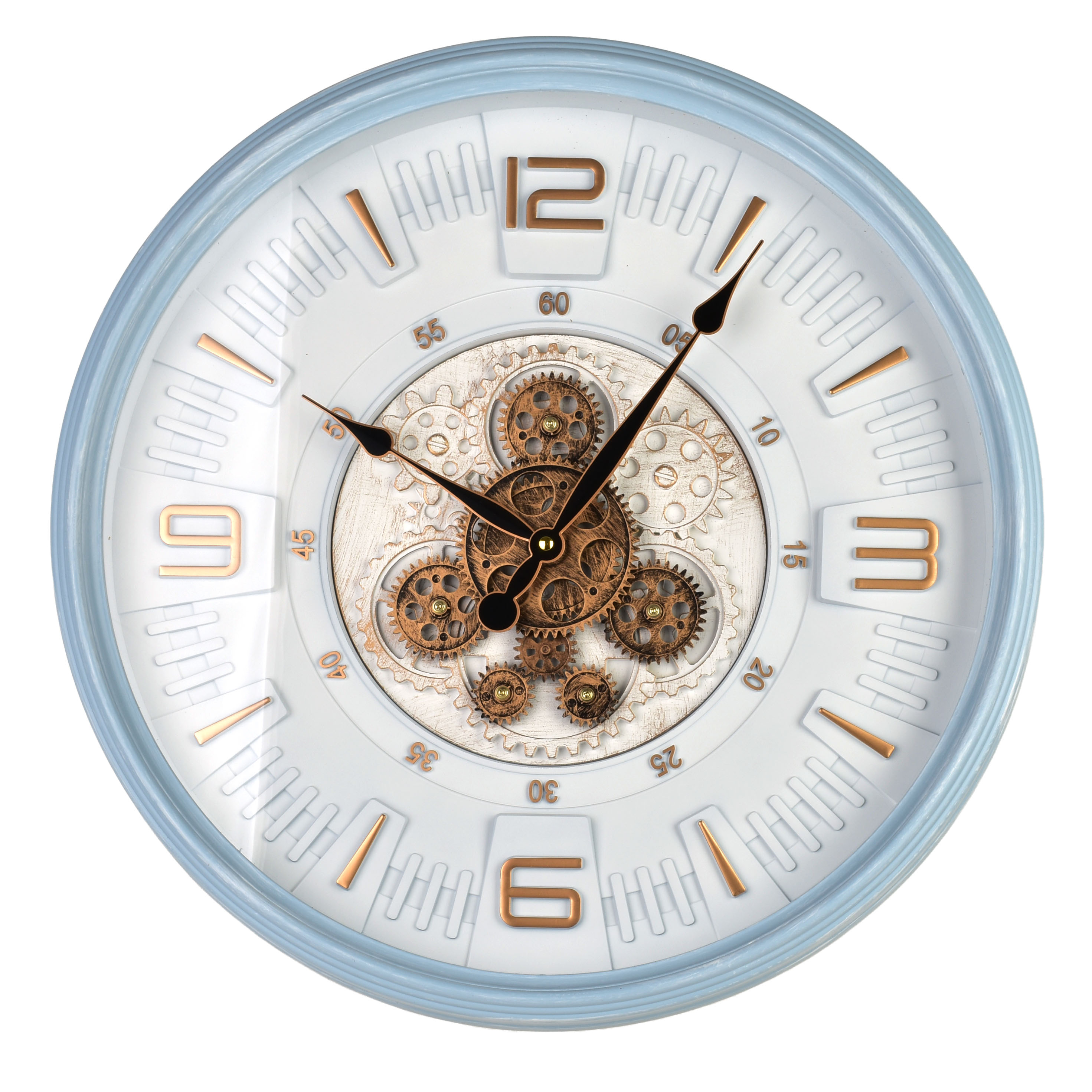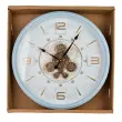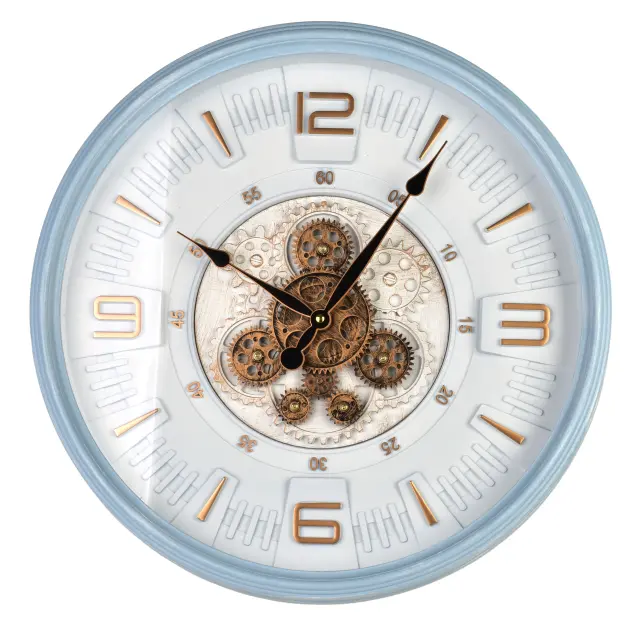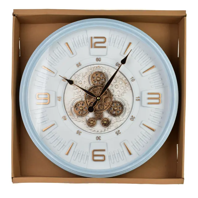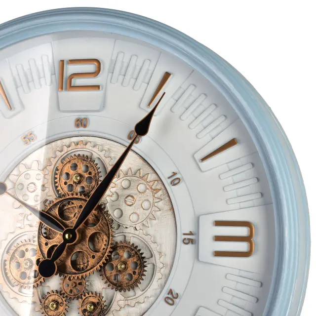 Reliefne arabske številke v sijoči zlati barvi ustvarjajo izrazit kontrast s svetlim ozadjem, kar izboljša preglednost. Zlati kazalci so barvno usklajeni s številkami, natančen mehanizem pa poskrbi za zanesljivo delovanje in urejen videz.