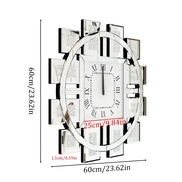 • Visokokakovostni materiali: Izdelana iz mešanice MDF in stekla, je ta ura tako trpežna kot vizualno privlačna, z izbočenimi ogledali, ki ustvarjajo sijoč učinek.