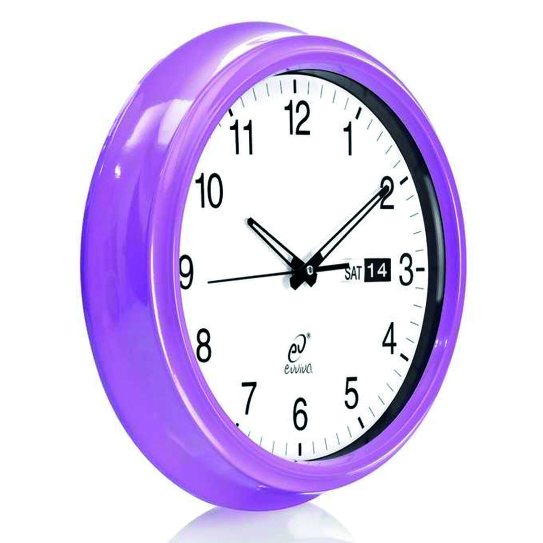 Okrogla stenska ura Vintage, premera 35 cm, je izdelana iz kovinskega ogrodja vijola barve. Krasi jo bela številčnica s črnimi arabskimi številkami in datumom. Deluje na baterije 1x AA 1,5V, ki niso priložene.