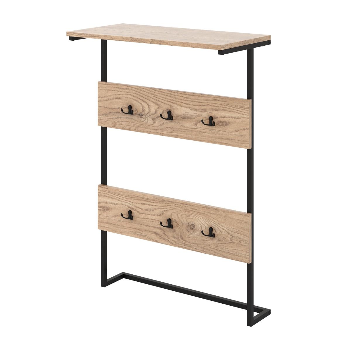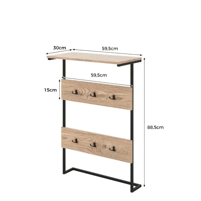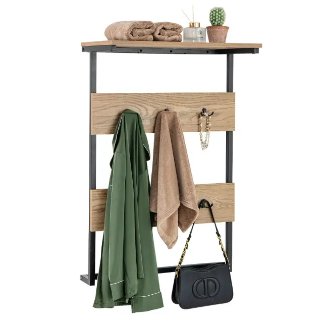 Zasnova 2 v 1 za več udobja: stenski obešalnik je sestavljen iz zgornje police in 6 kljukic, namenjenih priročnemu shranjevanju različnih predmetov. Na trpežne kovinske kljuke lahko obesite plašče, torbe, obeske za ključe in drugo.