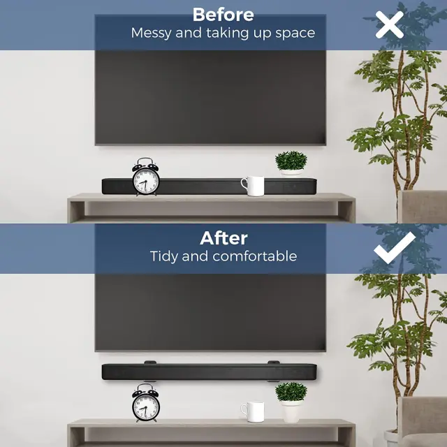 Zasnova, ki prihrani prostor: ta stenski nosilec je zasnovan tako, da prihrani prostor v vašem domačem kinu. Z namestitvijo zvočne vrstice na steno lahko sprostite dragocen površinski prostor na TV stojalu ali pohištvu.