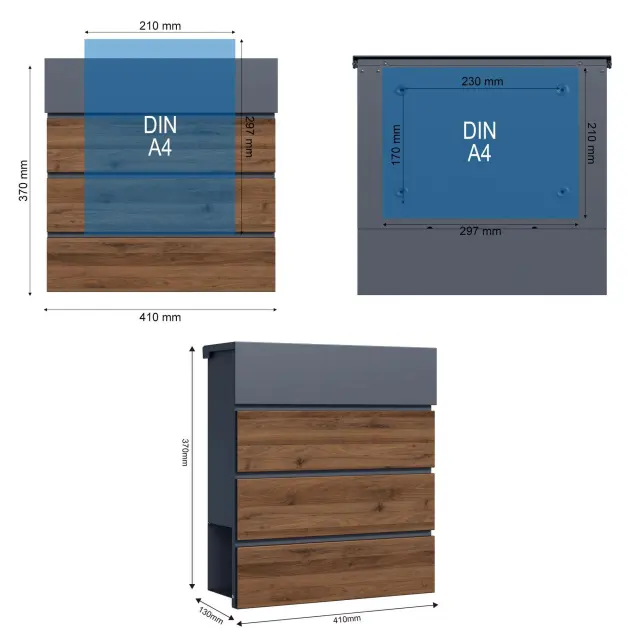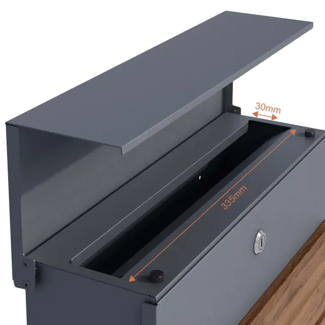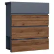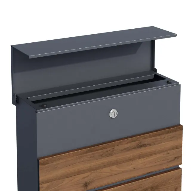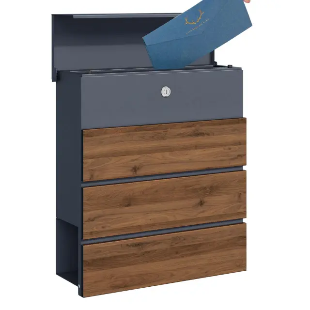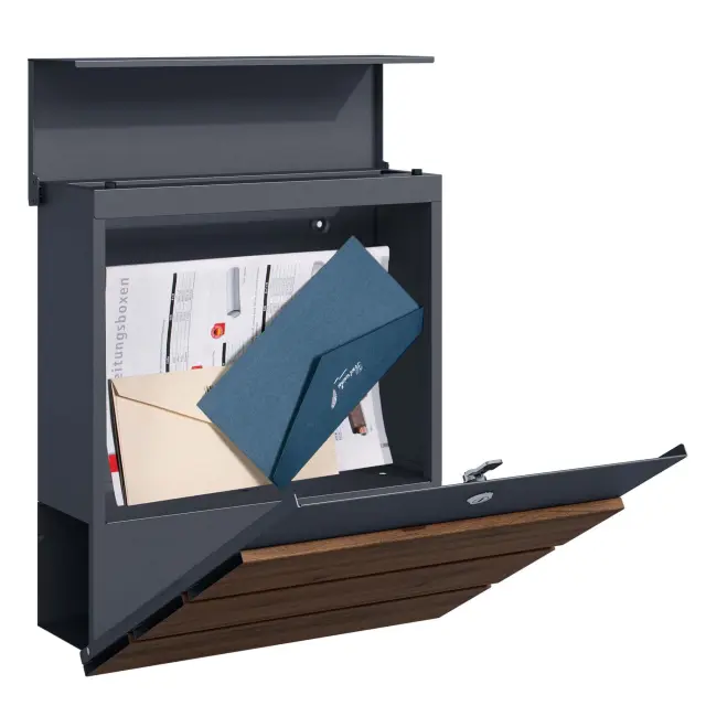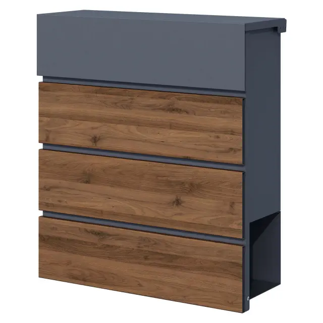 Dodajte svojemu domu eleganten in funkcionalen dodatek s stenskim poštnim nabiralnikom v antracitni barvi z detajli iz lesa. Ta sodobno oblikovan nabiralnik nudi dovolj prostora za vašo pošto in časopise, saj ima integrirano režo za časopis, kar omogoča ločeno shranjevanje tiskanih medijev. Njegova čista in minimalistična oblika se popolnoma prilega modernim fasadam, hkrati pa nudi vrhunsko funkcionalnost.