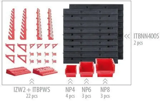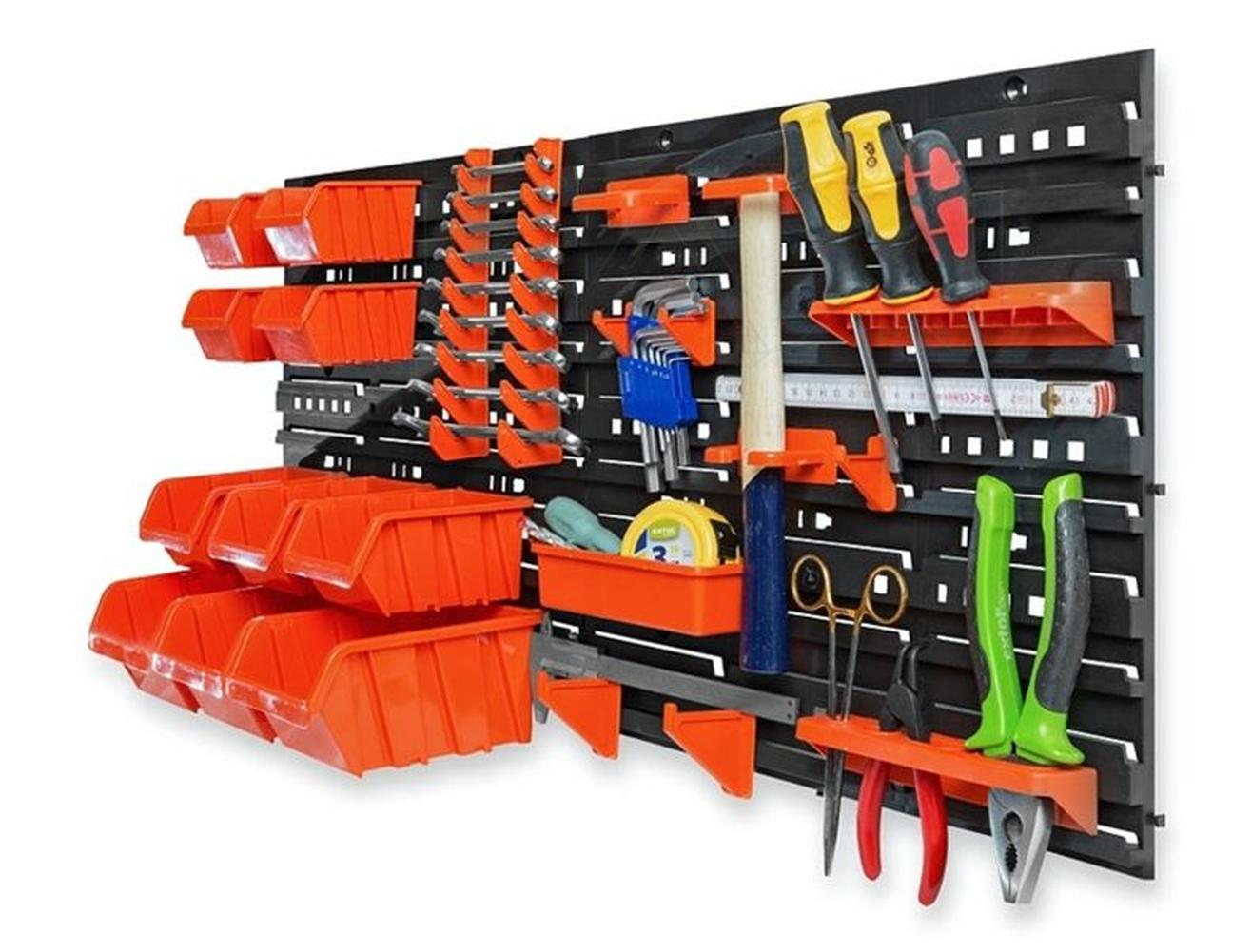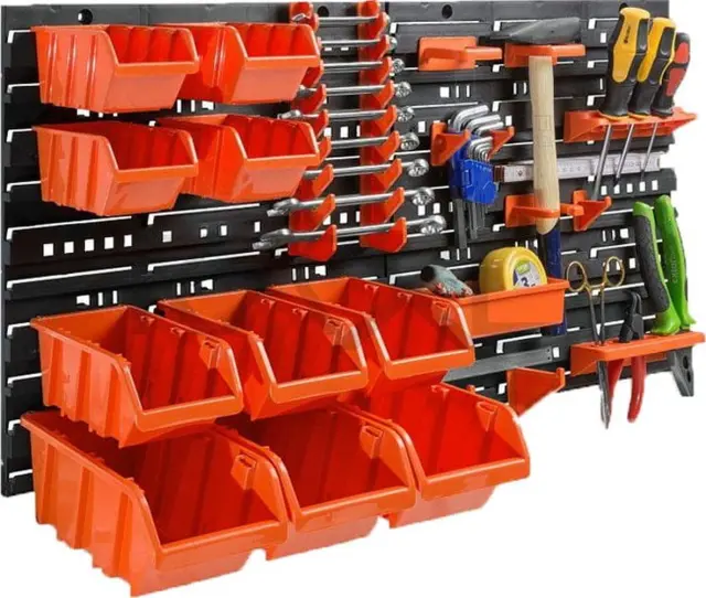 Ne glede na to, ali je v servisni delavnici ali zasebni garaži: ta večnamenski regal, ki ga sestavlja 34 košev, je idealna rešitev za vzdrževanje urejenosti delovnega mesta.