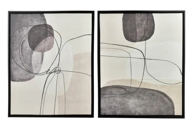 Vsaka slika je uokvirjena v črn okvir, ki poudari grafični značaj motiva in poskrbi za čist, izrazit zaključek. Motiva sta oblikovana kot usklajen par, zato skupaj delujeta kot celostna stenska dekoracija, hkrati pa ju lahko po želji obesite tudi ločeno in še vedno ohranite skladen vizualni učinek.