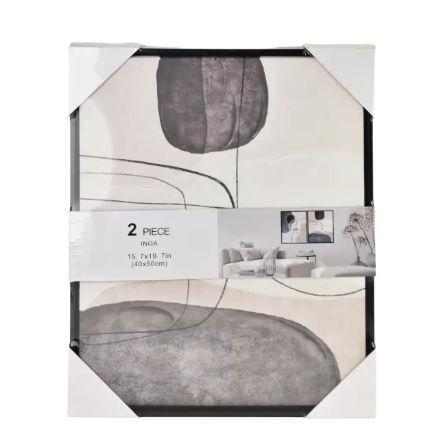 Komplet stenskih slik INGA vključuje 2 dekorativni sliki na platnu v formatu 40 x 50 cm, zasnovani v sodobnem abstraktnem slogu. Nevtralna in uravnotežena paleta črne, bele in bež barve prostoru doda eleganten, miren in urejen videz ter se enostavno poveže z različnimi barvnimi shemami in materiali v interierju.