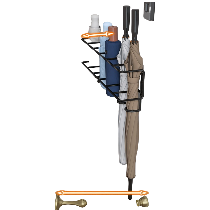 Zasnova, ki prihrani prostor: to elegantno in kompaktno držalo za dežnike je zasnovano tako, da poveča izkoristek prostora v vaši vhodni veži. Njegova stenska zasnova odpravlja potrebo po zajetnih talnih stojalih, s čimer sprosti dragoceno talno površino in zmanjša nered.