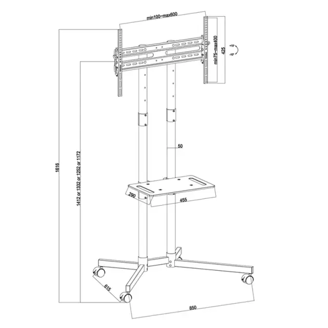 VESA: 100x100, 200x200, 300x200, 300x300, 400x200, 400x300, 400x400, 600x400 mm