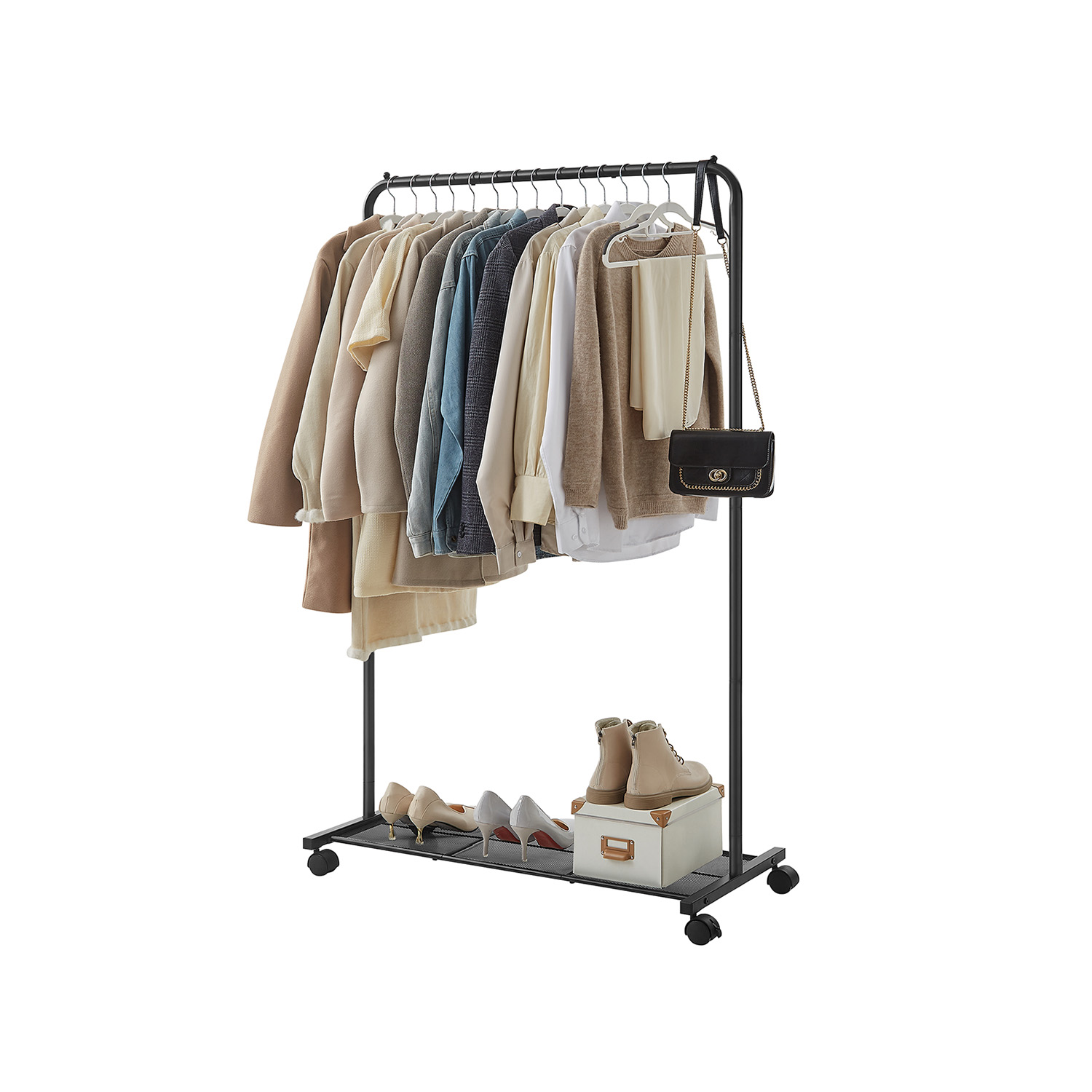 Stojalo za oblačila na kolesih, kovinsko stojalo za oblačila z enim vodilom s polico za shranjevanje, zgornja vodila podpira do 40 kg, črna HSR25BK