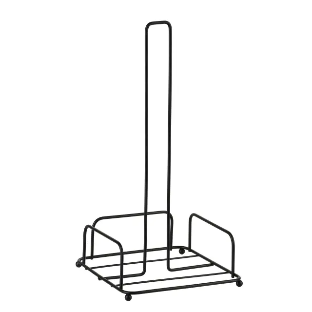 Eleganten in praktičen dodatek za vsako moderno kuhinjo. Stojalo je izdelano iz trpežne črne kovine z mat površino in ima preprost, vertikalen dizajn, ki omogoča enostavno doziranje papirnate brisače z eno roko. Stabilna konstrukcija zagotavlja, da se rola ne obrača ali podira med uporabo. Kompaktne dimenzije 15,5 x 15,5 x 31 cm zasedejo malo prostora, zato stojalo enostavno postavite na kuhinjski pult, polico ali v kot.