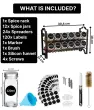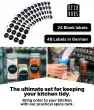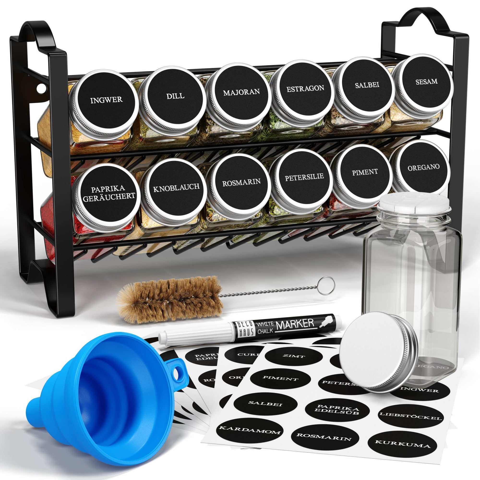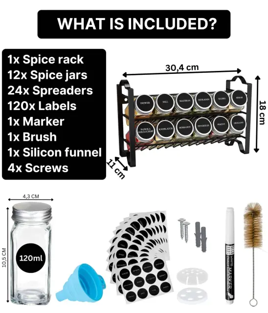 Organizirajte svojo kuhinjo – ta komplet vsebuje stojalo za začimbe, samolepilne blazinice, 12 kozarčkov, 48 nalepk, krtačko, kredno pisalo, dva pokrovčka za stresanje, lijak in material za pritrditev.