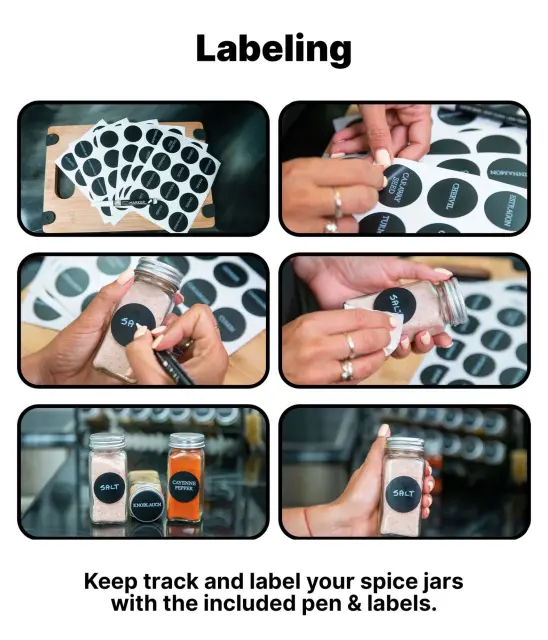 Začnete lahko takoj, saj to stojalo za začimbe dobite že sestavljeno. Kozarčke lahko opremite s prednatisnjenimi nalepkami ali pa uporabite prazne nalepke in jih s pisalom označite, kot želite.