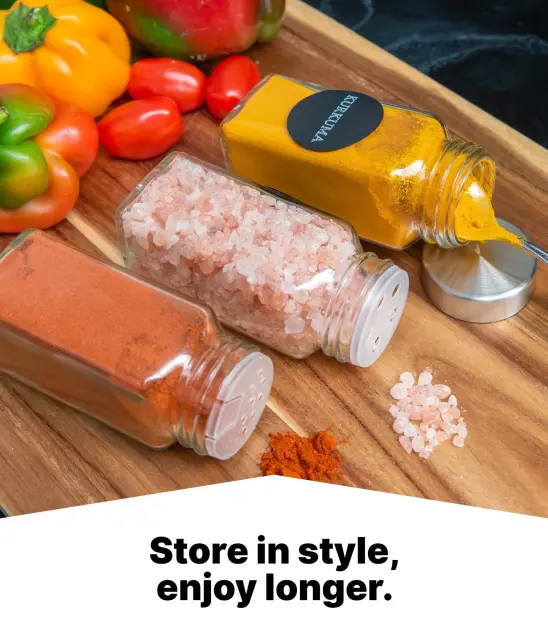 Naše stojalo za začimbe dobite že sestavljeno, tako da lahko takoj začnete z urejanjem. Da vam to še olajšamo, boste v kompletu dobili 48 nalepk, od katerih je polovica prednatisnjena. Druga polovica nalepk je prazna, kot nalašč za domače začimbe in mešanice.